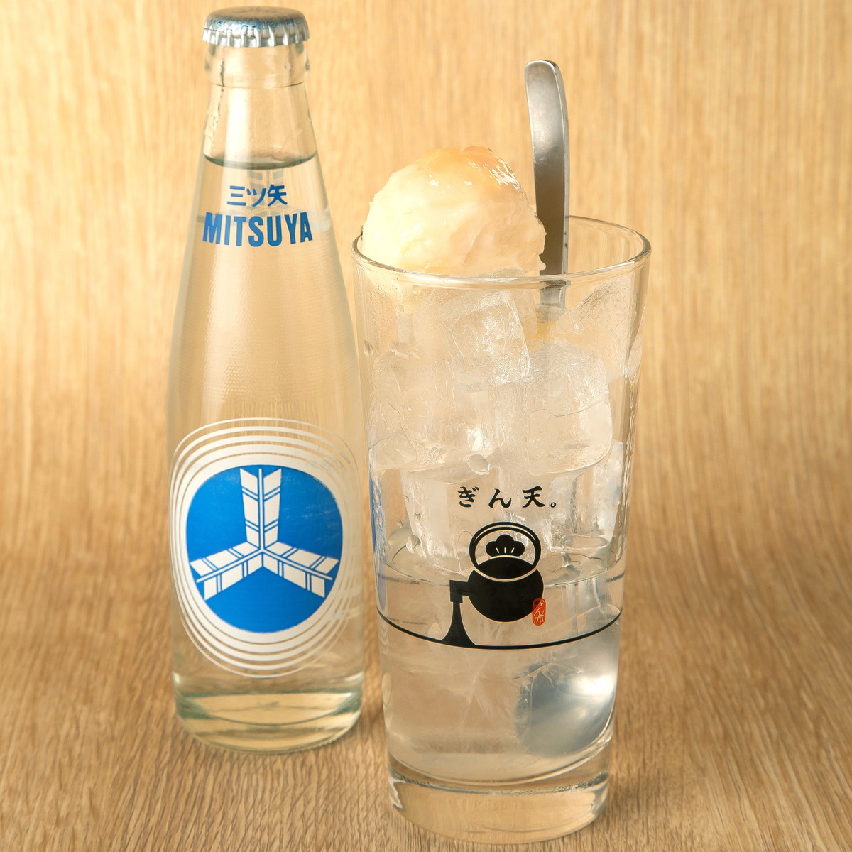 白桃シャーベットが乗った甘口サワーセット。三ツ矢サイダーが付きます。